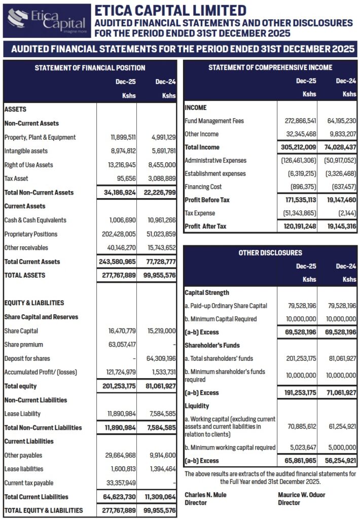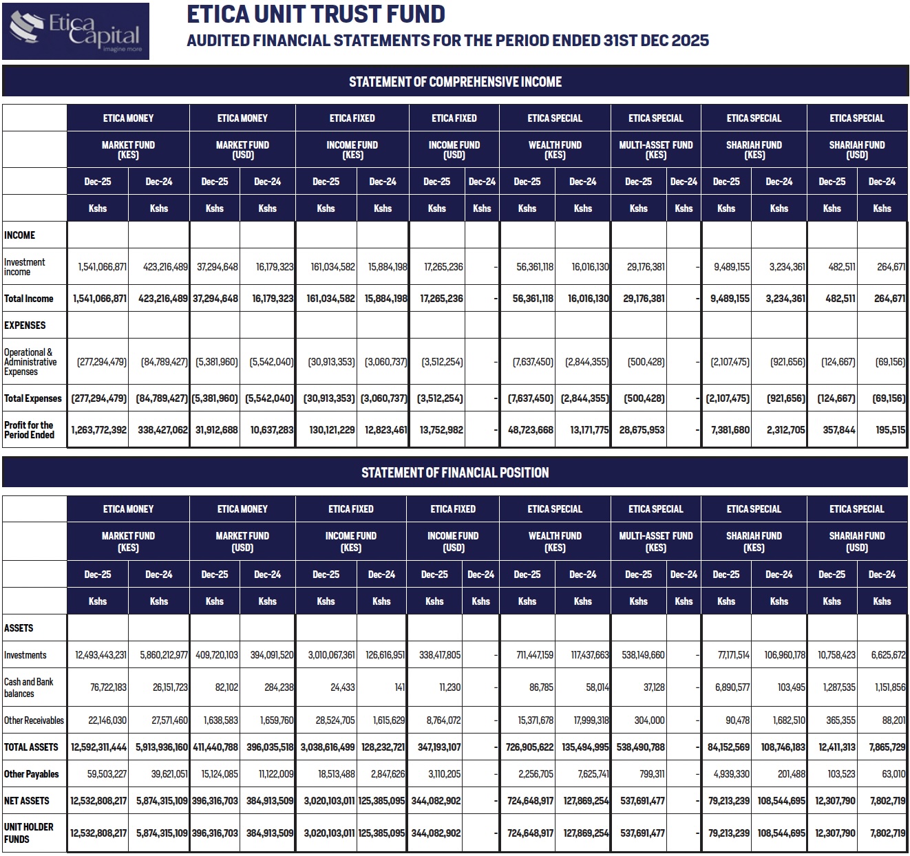 Etica Money Market Fund (KES) Effective Annual Yield 17.55% | Etica Money Market Fund (USD) Effective Annual Yield 6.99% | Etica Fixed Income Fund (KES) Effective Annual Yield 15.62% | Etica Shariah Fund (KES) Effective Annual Profit 9.64% | Etica Shariah Fund (USD) Effective Annual Profit 5.06% | Etica Wealth Fund - Class A (KES) Effective Annual Yield 15.77% Class B (KES) Effective Annual Yield 16.01% Class C (KES) Effective Annual Yield 16.25%